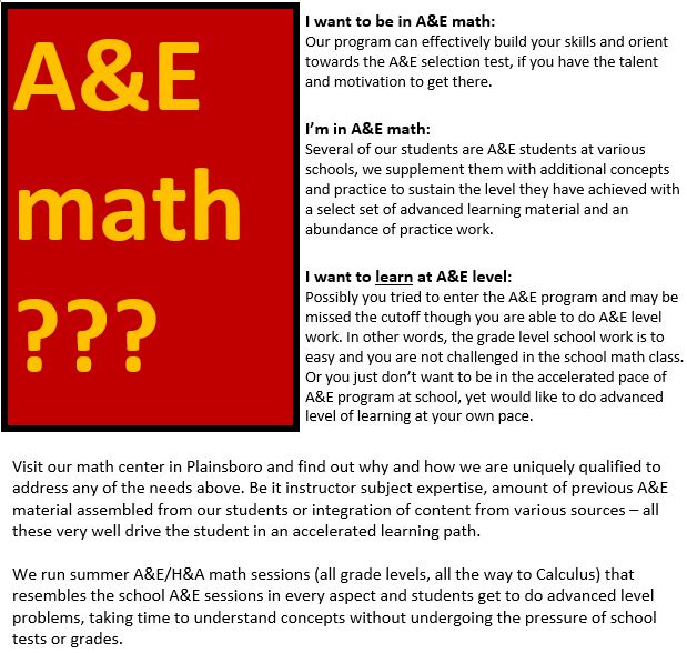 We use specially crafted material that is at the level or standard of the school A&E math program from previous years. We are able to do this becasue we have prepared several students in the past to pass the A&E test. We also had several students coming to us for enrichment while they were attending the school A&E program. Furthermore, many of our instructors have the direct experience of their own children attending the A&E program at the WW-P school.