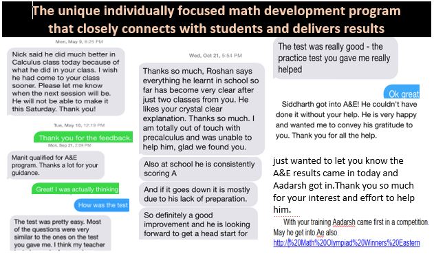 "My son has been attending the weekend classes at the mathmentor program for almost 2.5 years, we live in Pennsylvania and I drive him for almost an hour to the NJ location of the mathmentor and I would say it was worth the effort. During this period he progressed well at school from Algebra 2, precalculus to calculus. He learned ahead every summer. He was able to maintain grades at his school, get full score in SAT math and this week the AP Calculus score came out, he scored 5"
