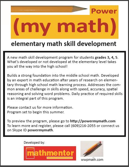 This is a unique math skills development and mentoring program we provide nationally. Once enrolled the student receives complete guidance over math study on a regular basis with 1-1 meetings over skype, phone call, sharing knowledge and reference material over email, QA sessions at the click of a button or IM. It's a direct communication line for all math needs including help on homework while school is in session.